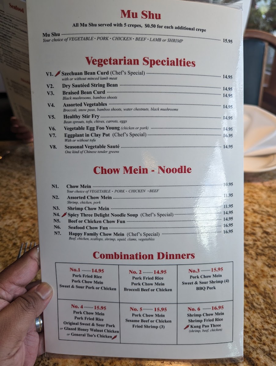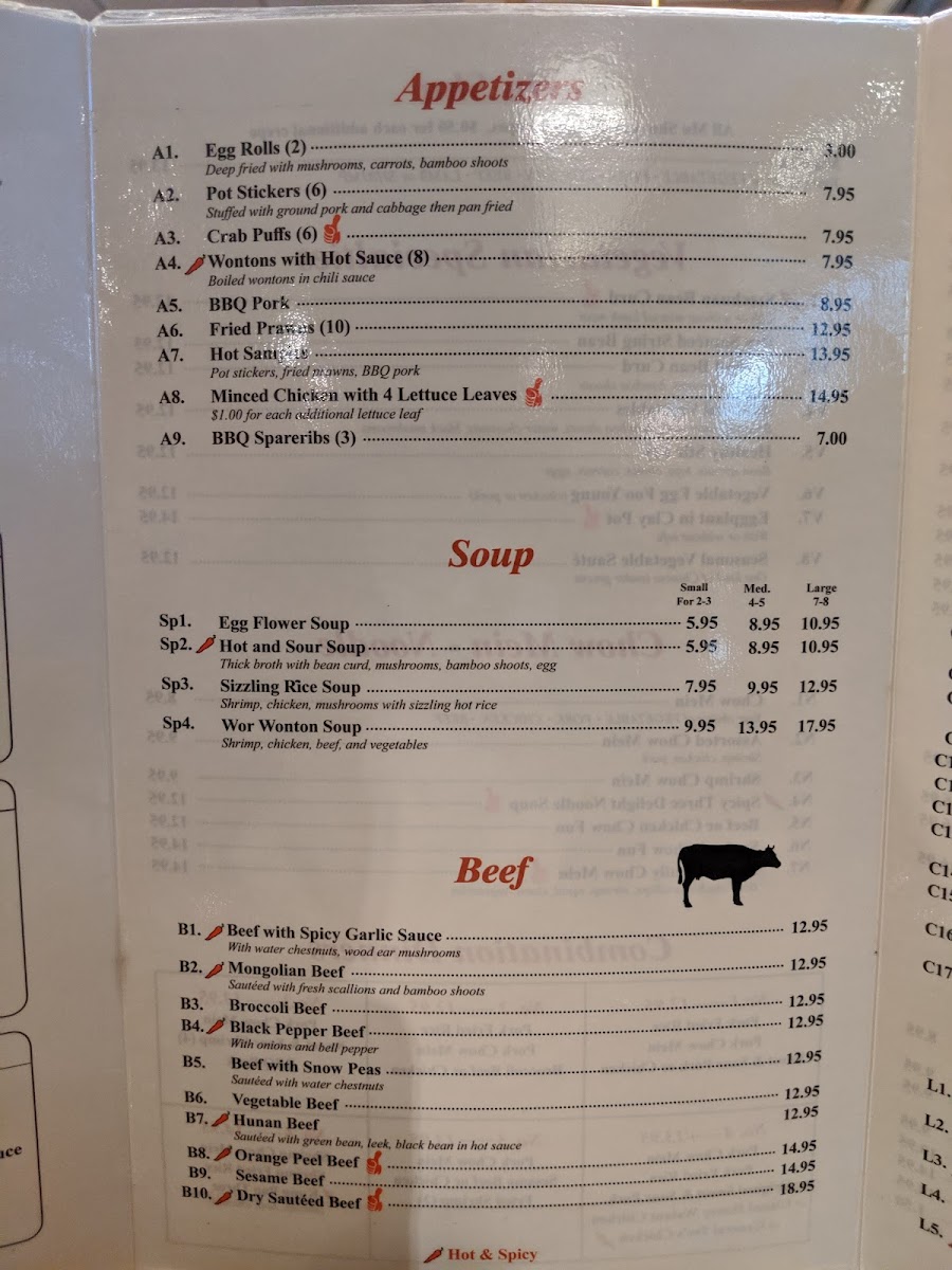 Start with classic appetizers like Crab Puffs or Wontons with Hot Sauce, ideal for sharing and setting a welcoming tone. Main courses range from hearty entrees such as Orange Chicken and Sweet and Sour Pork to savory noodles like Beef or Chicken Chow Fun, reflecting dishes that fit well with both quick meals and more leisurely sit-downs.